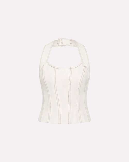The Signature Belted Corset in White flatters the form with its fitted silhouette and adjustable halter strap. Our signature belt detailing allows for a fully customisable fit to give a cinched effect to the waist. Crafted from 100% heavyweight cotton with contrast stitching and custom S&S buttons, this top is the perfect blend of structure and ease.